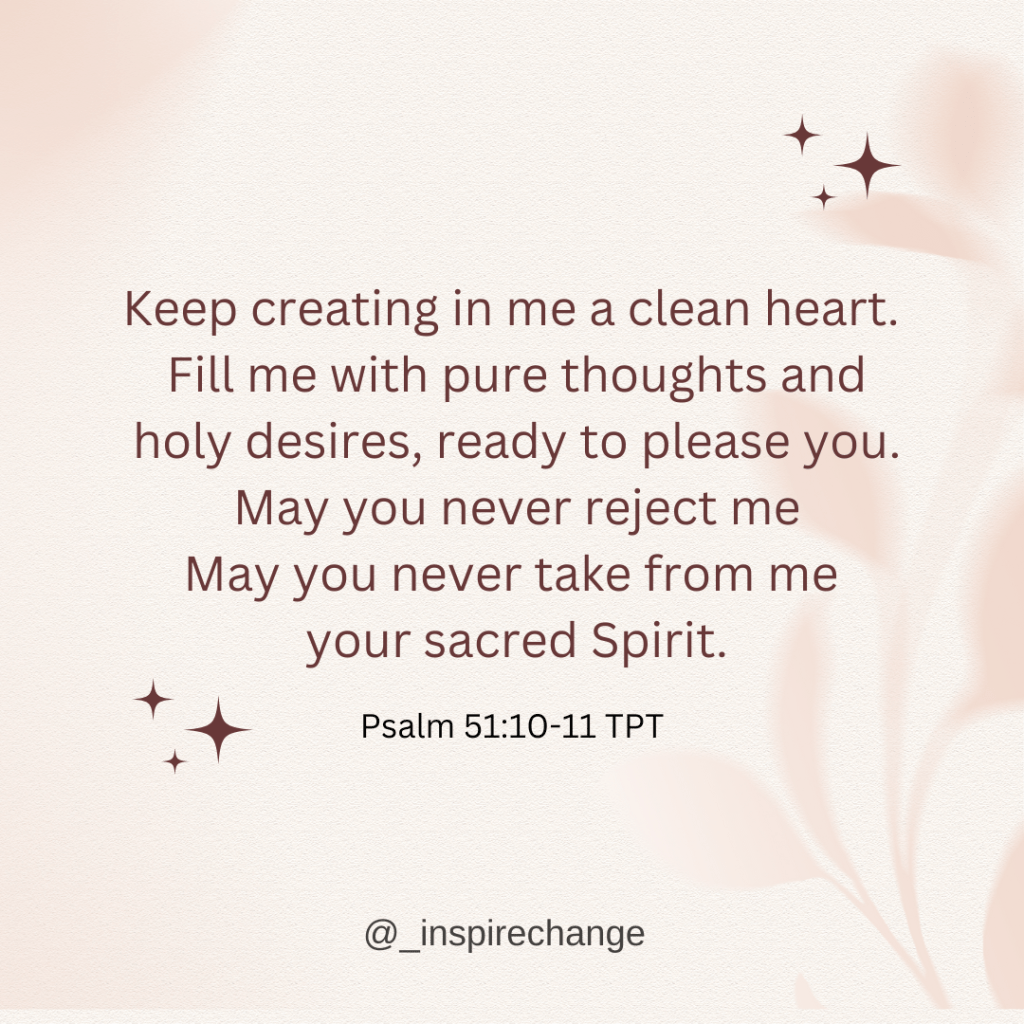 In the Passion Translation of the Bible, the verse reads: “Keep creating in me a clean heart. Fill me with pure thoughts and holy desires, ready to please you. May you never reject me! May you never take from me your sacred Spirit“.